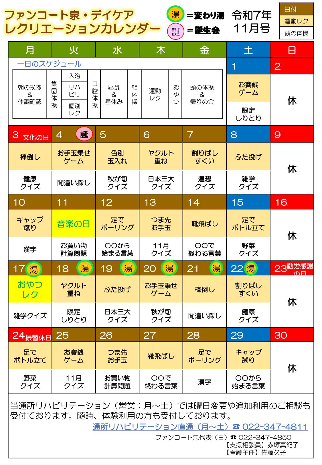 2025年11月のレクリエーションカレンダーをご紹介いたします。 11月は、『おやつレク🧁』や『🎵音楽の日🎶』を予定しております♪ また、運動レク🏋🏻♀️と頭の体操🧠のレクを毎日行っております! ※下記の画像をクリックしていただければ、詳 […]